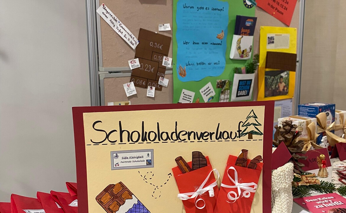 Am Mittwoch, 11. Dezember, sowie am Mittwoch, 18. Dezember, fand in den Pausen der diesjährige Adventsverkauf statt, organisiert vom Fairtrade-Team der Schule. Neben fair gehandelten Produkten wie Tee, Cookies, Schokoriegeln und weiteren kleinen Geschenkideen aus dem Würzburger Weltladen gab es in diesem Jahr auch selbst hergestellte faire Schokolade, über die sich viele Schülerinnen besonders freuten. Viele nutzten die Gelegenheit, um kleine Geschenke für die Weihnachtszeit zu kaufen.