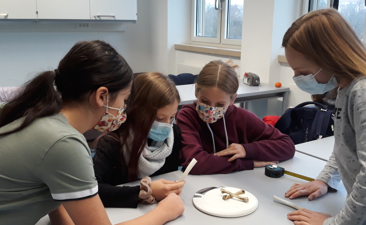 Dazu erhielten die Schülerinnen Säugetier- und Vogelknochen. Diese wogen und maßen sie während des Biologieunterrichts, um herauszufinden, welche Knochen leichter sind. Den Schülerinnen bereitete es große Freude mit einfachen Möglichkeiten wissenschaftlich zu arbeiten.