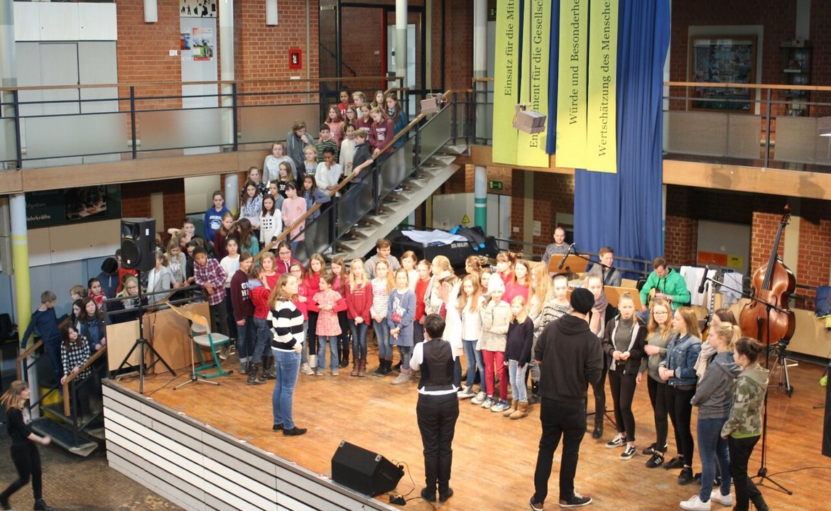 Die Chorleitung gab als Aufgabe, dass derjenige Chor, der sich am schwungvollsten „bewegt“, das Konzert gewinnt. Wir sind sehr stolz auf unsere 5 c, denn von allen  Unterstufenchören  haben  sie  gewonnen!  Unsere Klasse 5 c sang unter der Leitung von Julia Müller den Song „drag me down“ von der Band One Direction. Alle Unterstufenchöre rockten gemeinsam das Lied „Chöre“ von Marc Forster!