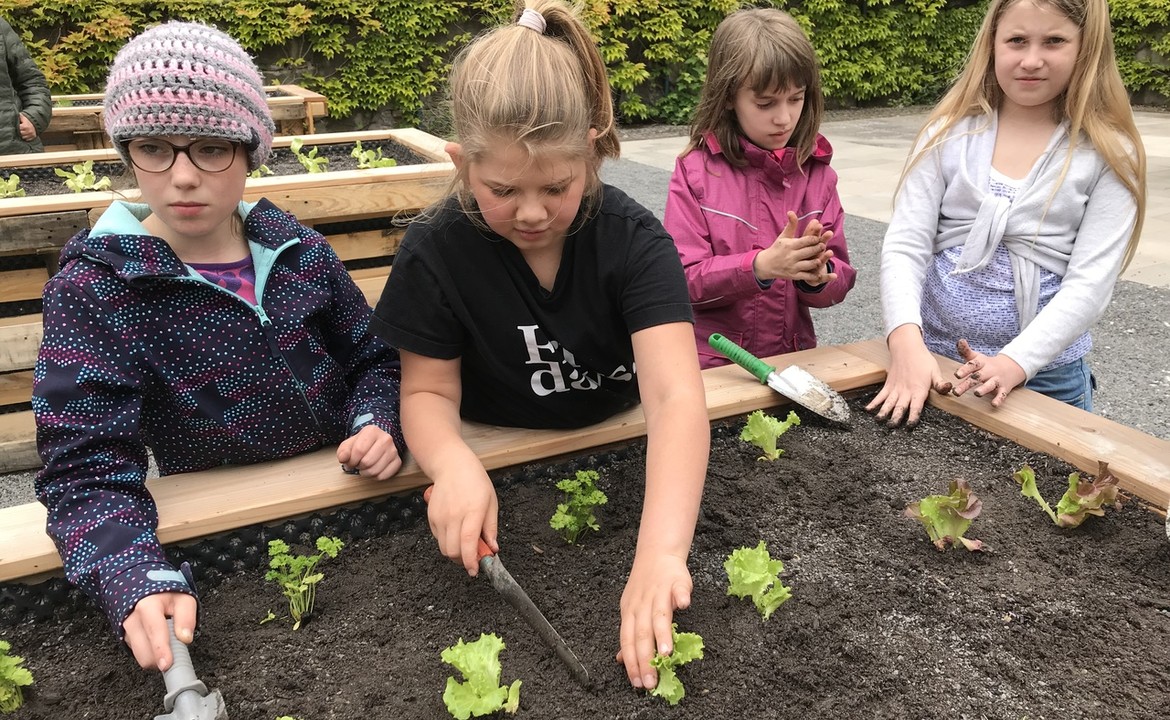 Genauer gesagt steht eines der neu eingerichteten Hochbeete im Schulgarten allein dem Salat zur Verfügung, welcher von unseren Küchendamen mitbetreut wird. Ein weiteres Beet wurde mit Tomaten, Pflücksalat und Kräutern unter tatkräftiger Unterstützung von Hr. Schnappauf und den Mädchen selbst bepflanzt. Es soll die nächsten Wochen auch weiterhin von ihnen gepflegt und gerade bei der wärmeren Witterung auch regelmäßig gegossen werden. So kann die Küche zur Bereicherung des eh schon leckeren und abwechslungsreichen Mittagessens immer darauf zurückgreifen. M. Rüth