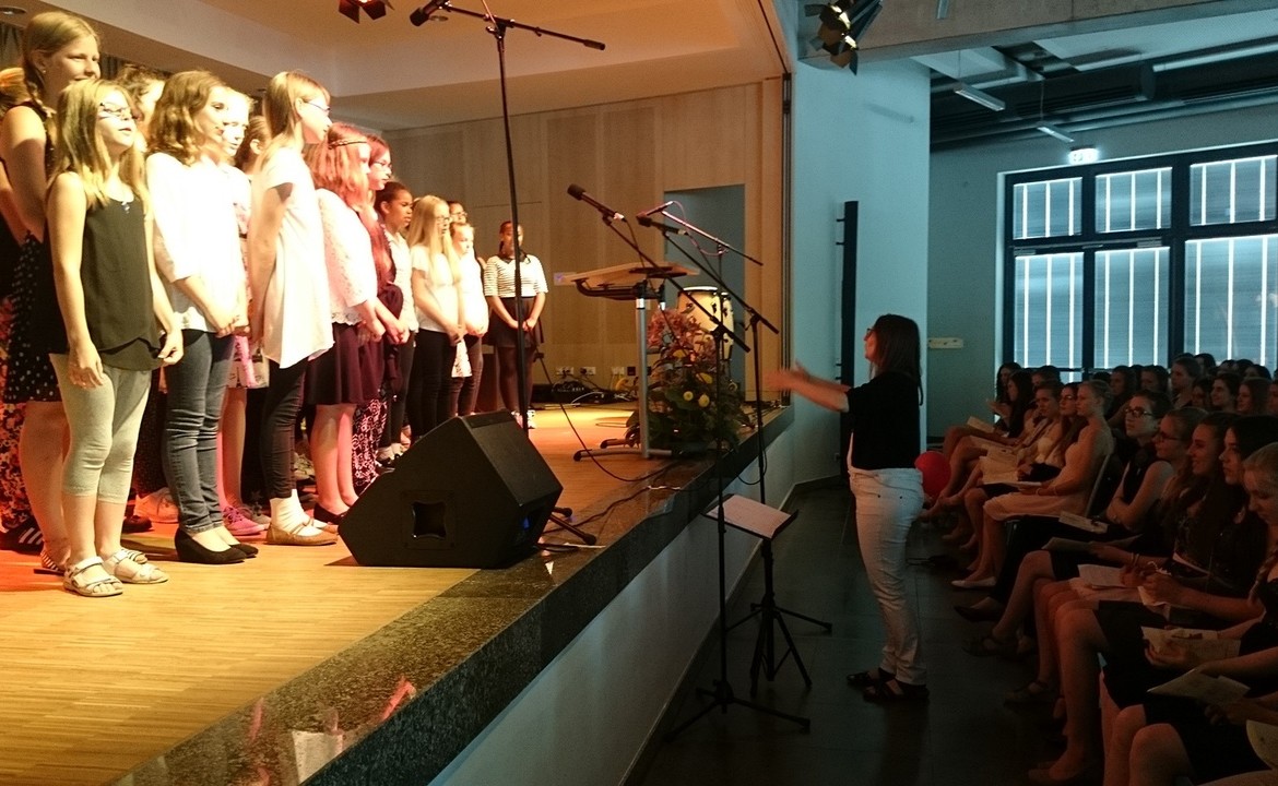 * Die festliche Abschlussfeier in der Pausenhalle mit all den guten Wünschen, den Ehrungen (der Klassenbesten, der Schulsprecherinnen und der Schülerinnen, die sich besonders im sozialen Bereich engagiert haben) und den musikalischen Darbietungen (s. Chor der Tutorenkinder und Bläsergruppe).