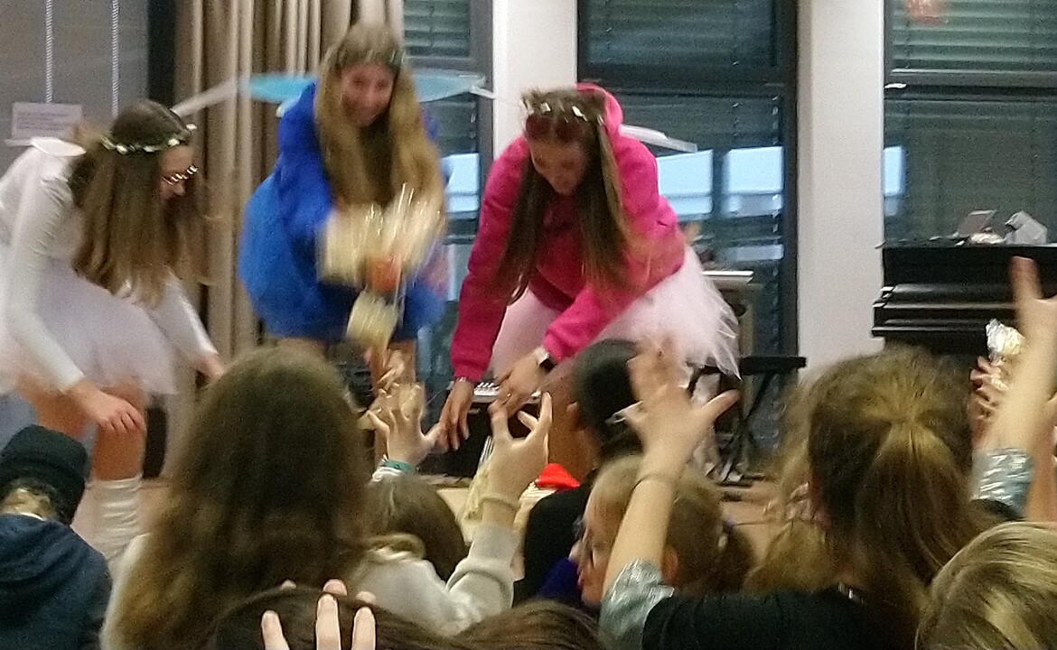 „HELAU!!!!!!“ Es war ein bunter Nachmittag, eingebettet in die MOTTO-Woche der SMV-Mädels! (Thema am Donnerstag war „MÄRCHEN“.) Egal ob Flamencotänzerin, Bambi, Harry Potter, Hutmacher, Indianerin oder Lama: engagiert waren alle beim Mittanzen, bei der „Reise nach Jerusalem“ und beim Schaumküsse-Wettessen mit dabei. Unsere Schulleiterin Frau Thum-Feige hat, verkleidet als Pumuckl, von allen angefeuert in einem der Durchgänge gewonnen! ; ) Für Begeisterung sorgte auch der Schlusspunkt unseres Schulfaschings:eintraditioneller Faschingsbonbons-Regen! M. Gehr