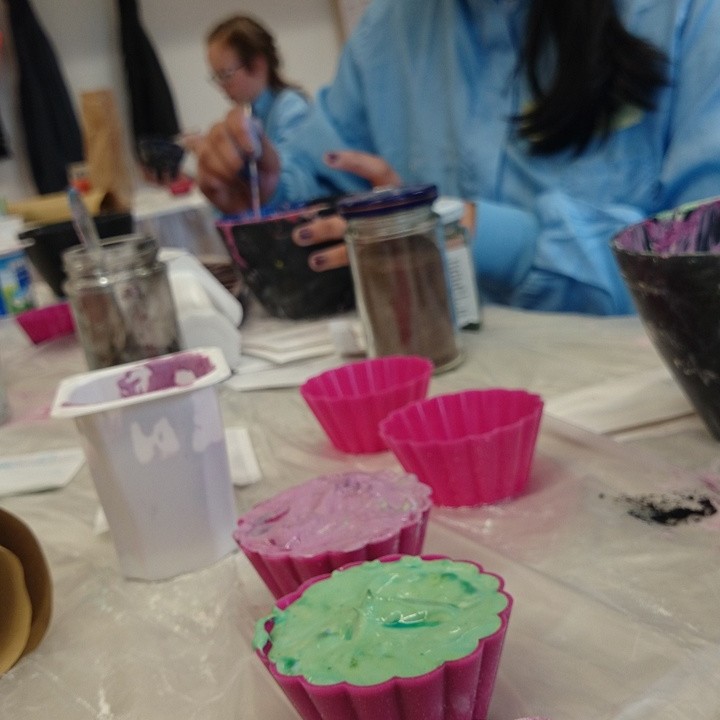 Die Schülerinnen stellten aus Gips und Zusätzen wie Karottensaft, Spinatbrühe und Zimt bunte, duftende Kreide her, gewannen einen Einblick in die außergewöhnliche Kunst von Beuys und probierten die eigene Kreide auf dem Schulhof aus.