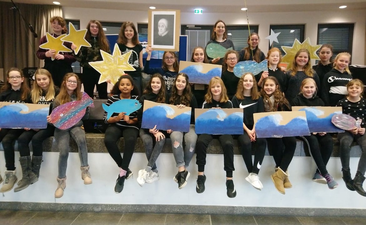 „Ein Fischer und seine Frau lebten an der Küste eines großen Meeres“ – so beginnt unser Musical „Der Stern“, das wir in der Maria-Ward-Woche in der Vollversammlung aufführten. Wir, die Klasse 6 b mit Frau Bäuerlein, haben im Musikunterricht mehrere Lieder für das Musical zweistimmig eingeübt und nebenbei aus Karton ein Boot, Wellen, Fische, Sterne, ein Haus und Möbel dafür „gebaut“, gebastelt und bemalt … Wir waren alle gut beschäftigt; Finnia, Mia Z. und Vicky übten immer wieder zur Klavierbegleitung mit Frau Bäuerlein Flöte und Klarinette und Lorena, Julia und Greta fleißig ihre Lesetexte.