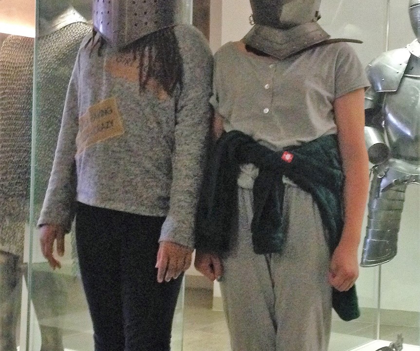 Die Mädchen erkundeten im Anschluss in zwei Gruppen mit je einem Museumspädagogen die Zeit der Ritter. Interessiert lauschten die Kinder den Informationen und durften sich selbst einmal wie ein Burgfräulein kleiden oder einen Rüstungshelm anprobieren. Auch von dem schweren Gewicht eines Kettenhemdes konnten sich die Schülerinnen überzeugen. Das Highlight war das Nachstellen einer Ständepyramide. Hierbei durften sich die Mädchen standesgemäß verkleiden und erfahren, dass der Kurfürst ganz oben in der Hierarchie stand, Bauern dagegen dem untersten Stand angehörten.