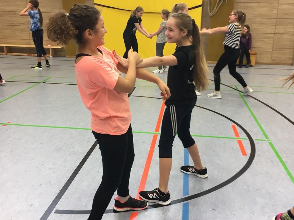 Dann war der praktische Teil an der Reihe: Mit viel Geduld zeigte Herr Fehrer den Mädchen die einzelnen Bewegungsabläufe, welche dann in Partnerübungen aktiv ausprobiert werden sollten. Natürlich durften die neu erlernten Techniken auch am Trainer selbst ausprobiert werden, sodass die Begeisterung groß war, als eine Schülerin Herrn Fehrer sogar „aufs Kreuz legte“.