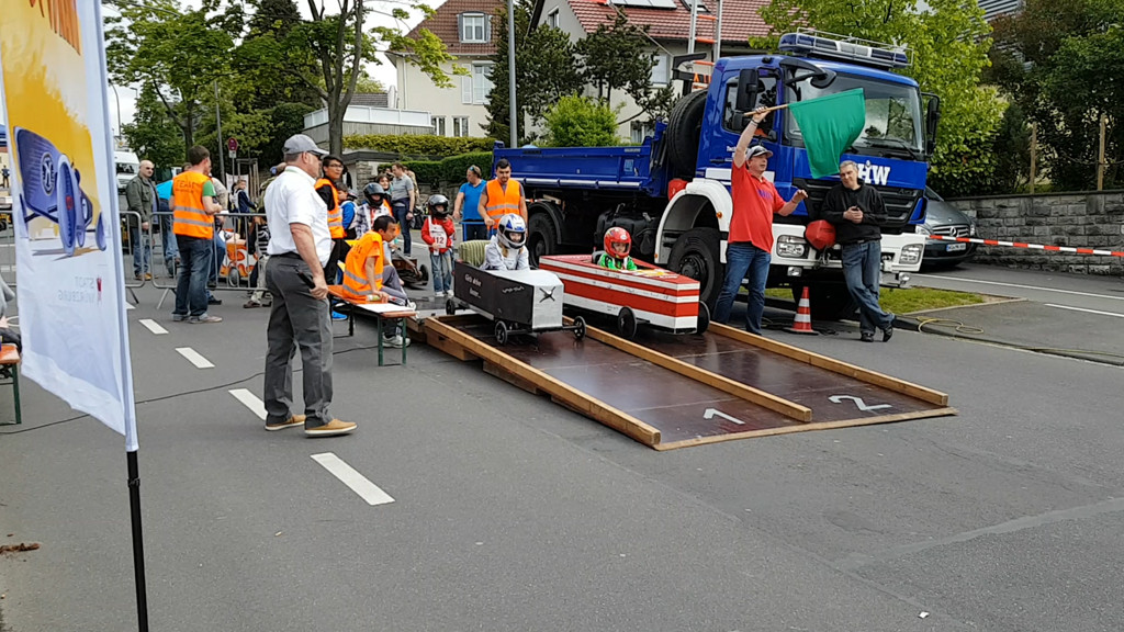 Mit Hilfe der Familie Hofmann transportierten wir um 08:30 Uhr unsere Autos zur Strecke. Die Fahrerinnen trugen sich in die Wettkampfliste ein und bekamen ihre Startnummern. Die Seifenkisten mussten erst einmal zum TÜV. Herr Hess hatte sehr gute Arbeit geleistet – die Lenkungen funktionierten einwandfrei und über die guten Bremsen waren die Herren vom TÜV erstaunt.