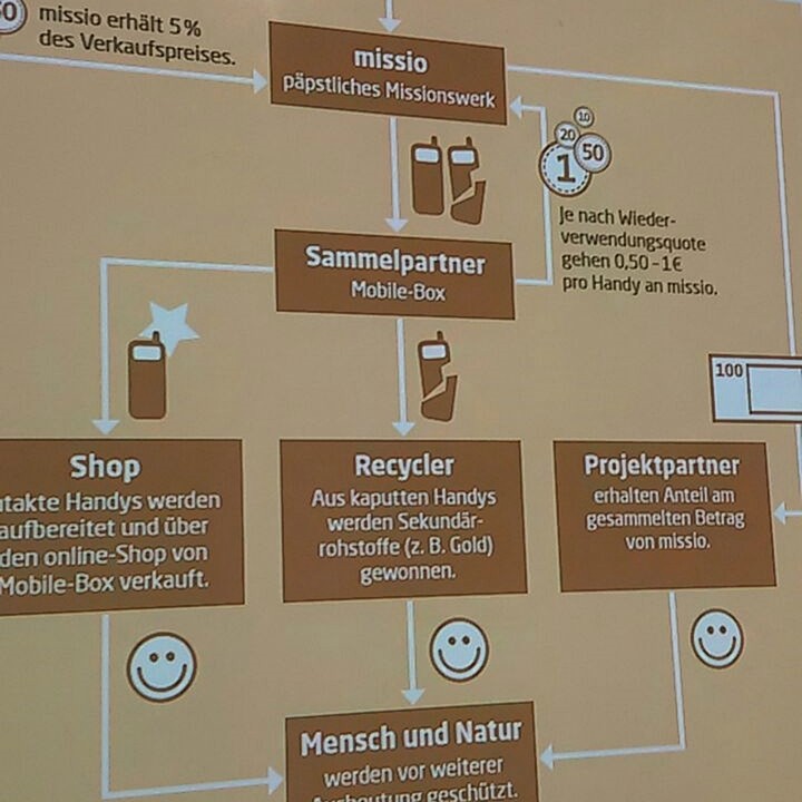 Missio München sammelt alte Mobiltelefone für den guten Zweck. Je nachdem ob das Handy wiederverwendet werden kann oder in Sekundär-Rohstoffe zerlegt wird, erhält die Missio für jedes Telefon eine Vergütung zwischen 0,50 – 1 €. Dabei geht Wiederverwendung vor Verwertung!