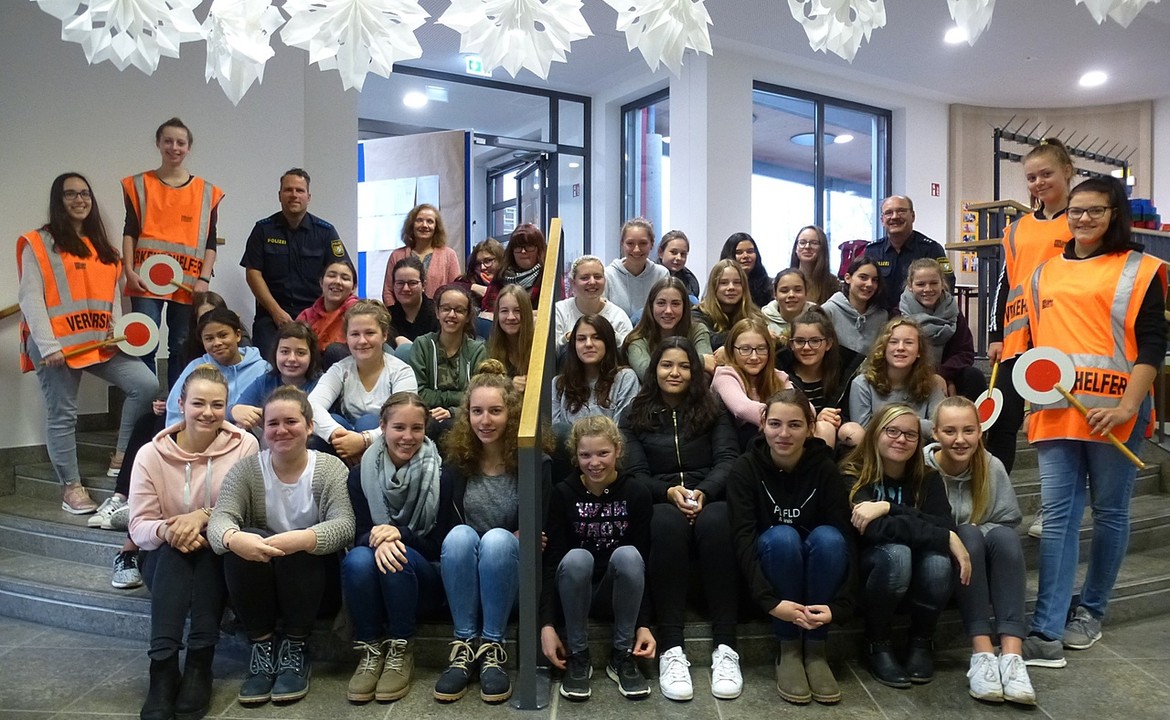 Über die große Anzahl an Lotsen an unserer Schule haben sich die beiden Polizisten sehr gefreut – das ist wirklich vorbildlich! Auch im kommenden Jahr werden unsere Schülerlotsinnen wieder dafür sorgen, dass unsere Schülerinnen gefahrlos die Straße vor der Schule überqueren können und im Januar werden weitere 17 Schülerinnen der 7. Klasse ihre Ausbildung als Schülerlotse absolvieren. Wir freuen uns darauf J