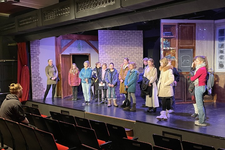 Im Anschluss an die Aufführung durften die Schülerinnen der Schulspielgruppe noch selbst die „richtige“ Bühne erkunden und allgemeine Fragen an den Techniker stellen. Dieser berichtete über die Entstehung eines Bühnenbildes und die unendlichen Kostüme und Requisiten, die aber natürlich alle an einem anderen Ort gelagert werden. Erstaunt waren die Mädchen aber vor allem von dem extrem hellen Licht auf der Bühne und stellten fest, dass ein Erkennen des Publikums kaum möglich ist. Das beruhigte viele, da doch die Möglichkeit besteht, ihre eigene Produktion dort aufzuführen.