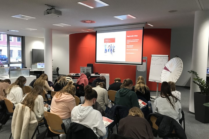 Unseren Schülerinnen stehen nach dem Schulabschluss viele Türen offen, aber den richtigen Weg zu finden ist nicht immer leicht. Aus diesem Grund besuchte die 9c Anfang Oktober das Berufsinformationszentrum (BiZ) in Würzburg. Dort wurden den Mädchen Möglichkeiten aufgezeigt, für Fragen rund um die Berufs- und Studienwahl eine individuell passende Antwort zu bekommen. Zuerst informierte Frau Rattka-Nüdling über die vielen verschiedenen Ausbildungsberufe, Bewerbungsfristen und Anforderungen der unterschiedlichen Branchen. Sie verwies auch auf die Möglichkeit der individuellen Beratung in Form eines persönlichen Gesprächs an unserer Schule. Anschließend lernten die Schülerinnen einzelne Programme auf der Internetseite der Bundesagentur für Arbeit kennen, die sie auch von zu Hause nutzen können.