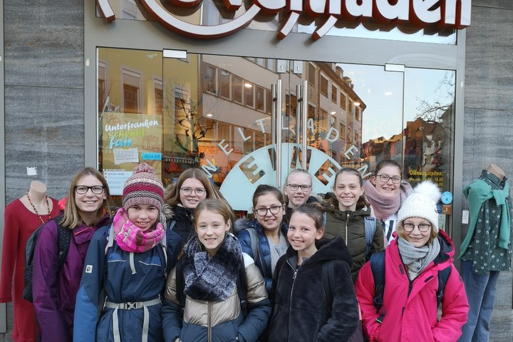 Im Dezember besuchte das Fairtrade-Team den Weltladen in Würzburg. Nach einer kleinen Einführung gab Thomas Mitschke, Mitarbeiter des Ladens, den Schülerinnen Aufgaben, bei denen sie sich mit Produkten des Geschäfts beschäftigen sollten. Eine Gruppe betrachtete ein paar Sneakers und stellte fest, dass diese ausschließlich aus natürlichen Materialien bestehen. Mit dem Kaffeepreis befasste sich ein weiteres Team, andere Schülerinnen mit Schokolade aus Ghana. Den Schülerinnen wurde klar, dass sie mit dem Kauf fair gehandelter Produkte dazu beitragen, dass Menschen weltweit eine faire Chance bekommen. Mit weiterem Fachwissen ausgerüstet startet das Team ins neue Jahr und kann beim wöchentlichen Verkauf in der Pause auch Hintergründe zu seinen Produkten weitergeben. Carolin Seubert