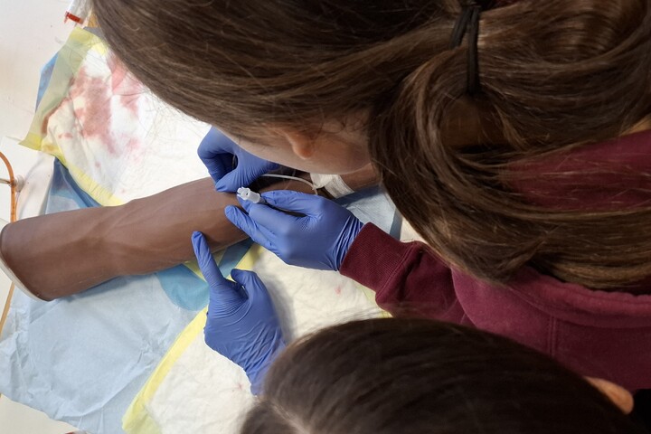 Verschiedene Stationen, die von Praxisanleiterinnen und erfahrenen Pflegekräften betreut wurden, boten den Jugendlichen spannende Einblicke in den Unialltag: So lernten wir, wie man Vitalzeichen misst, die Schülerinnen durften Verbände anlegen, es wurden Babypuppen gewickelt, wir schnupperten in der Aromakunde, es wurden Zugänge gelegt, Keime und Bakterien unter dem UV-Licht gesucht, OP-Kittel angezogen und OP-Besteck inspiziert. Sehr anschaulich wurde die Implantation eines Stents bei einem Herzinfarkt beschrieben. Bei der Station der Beatmung wurde von der klassischen Reanimation an einem Dummie bis hin zum automatischen Beatmungsgerät alle Variationen gezeigt (und wer wollte, durfte dies auch selbst ausprobieren). Sehr viel Spaß bereitete den Schülerinnen der Rollstuhlparcour oder auch der Versuch auf Krücken zu laufen.