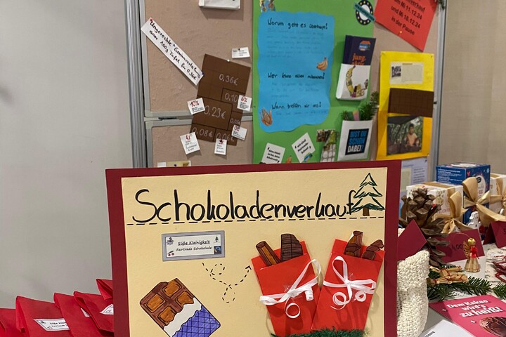 Am Mittwoch, 11. Dezember, sowie am Mittwoch, 18. Dezember, fand in den Pausen der diesjährige Adventsverkauf statt, organisiert vom Fairtrade-Team der Schule. Neben fair gehandelten Produkten wie Tee, Cookies, Schokoriegeln und weiteren kleinen Geschenkideen aus dem Würzburger Weltladen gab es in diesem Jahr auch selbst hergestellte faire Schokolade, über die sich viele Schülerinnen besonders freuten. Viele nutzten die Gelegenheit, um kleine Geschenke für die Weihnachtszeit zu kaufen.