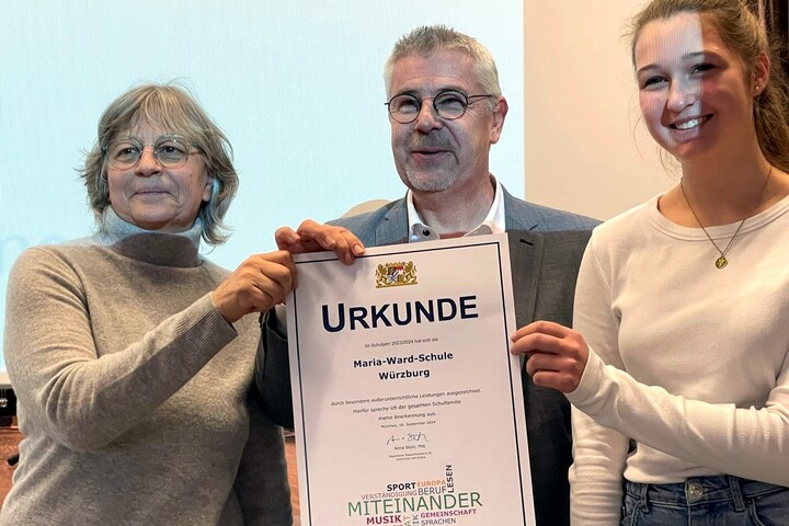 Jedes Jahr zeichnet das Kultusministerium Schulen in Bayern für besondere Aktivitäten aus, die nicht unbedingt mit dem täglichen Unterricht zu tun haben. In diesem Jahr war die Maria-Ward-Schule ganz vorne dabei und belegte unter den unterfränkischen Realschulen einen beachtlichen dritten Platz. Zu einer Feierstunde mit Marcus Ramsteiner, dem Ministerialbeauftragten für die unterfränkischen Realschulen, hatten sich neben der Schulleitung um Birgit Thum-Feige und Vertretern des Stiftungsvorstandes, des Freundeskreises und des Elternbeirates natürlich auch die Geehrten selbst, nämlich die Schülerinnen der Schule samt ihrer Lehrkräfte, eingefunden.