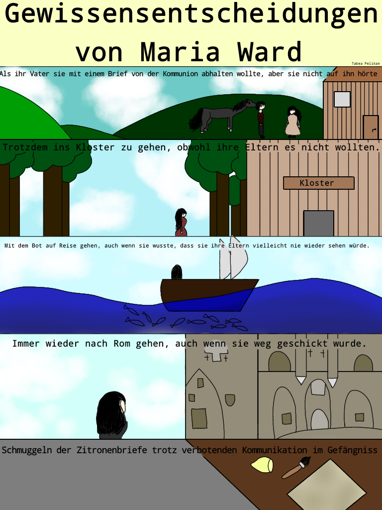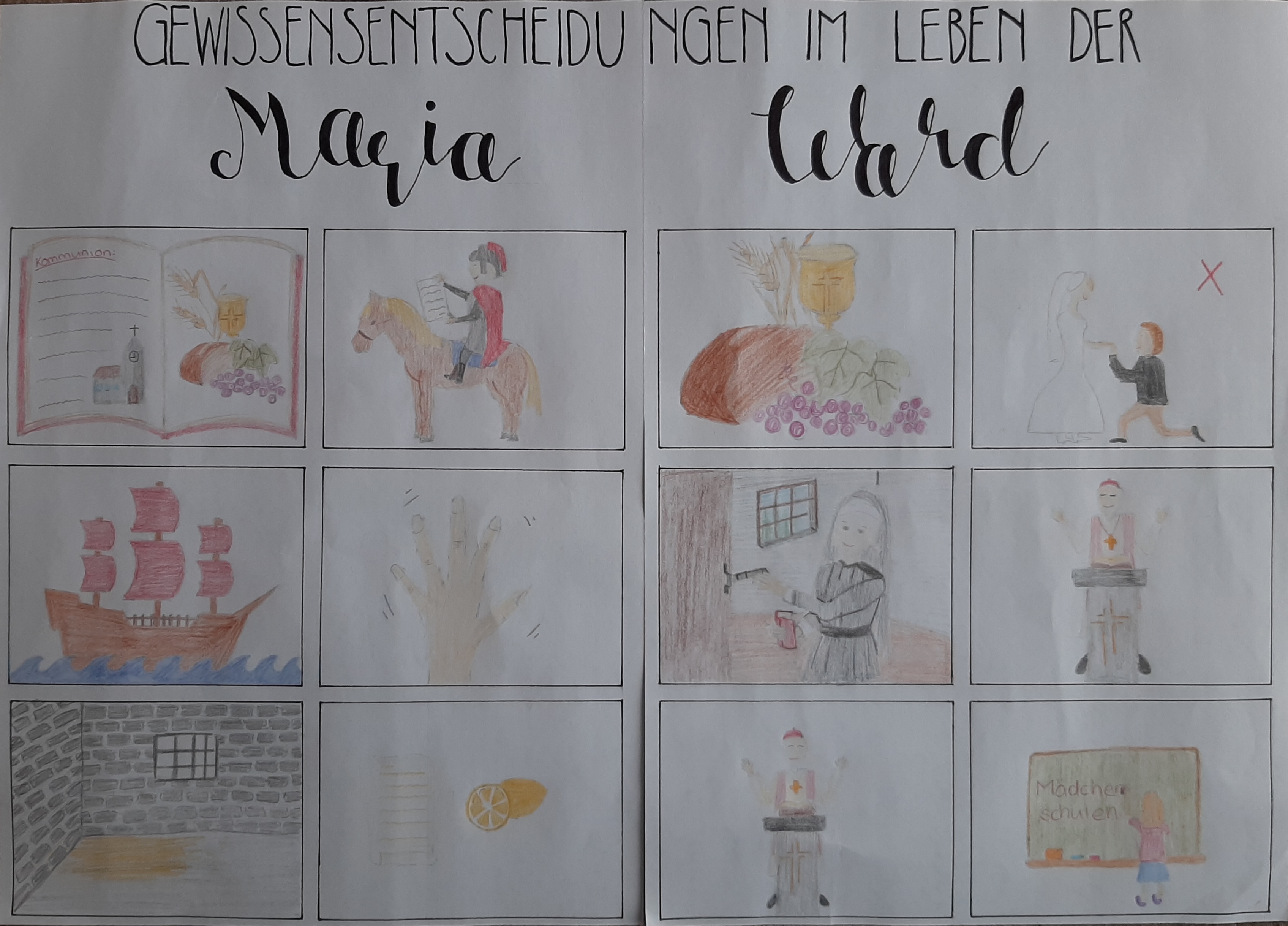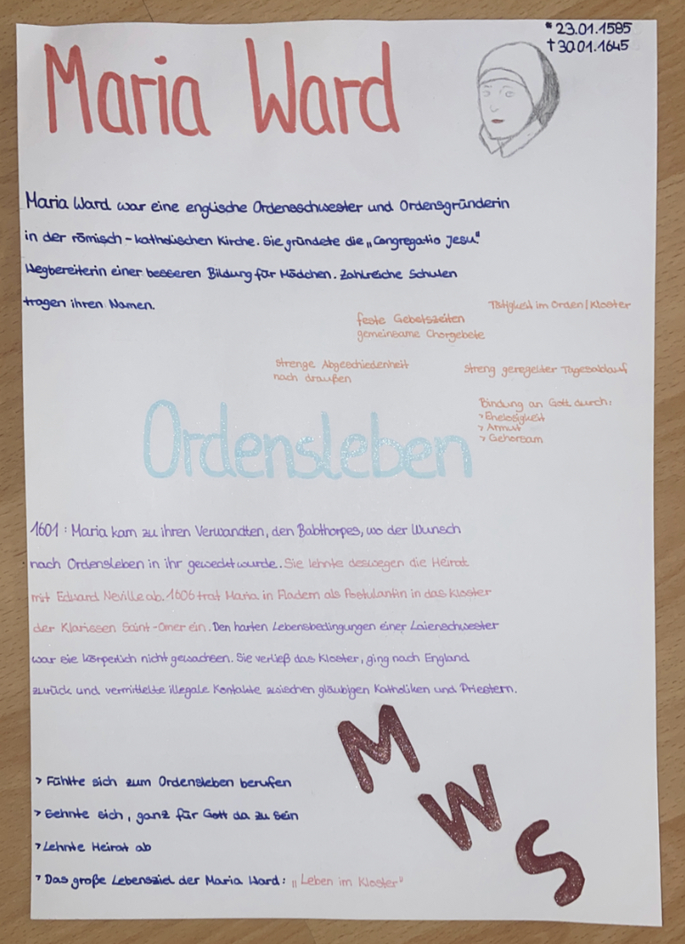 Zur Tradition unserer Schule gehört es, sich in der Maria-Ward-Woche vom 23.-30. Januar mit dem Leben dieser bemerkenswerten Frau, nach der unsere Schule benannt ist, zu beschäftigen. Zum Bedauern der gesamten Schulgemeinschaft mussten wir in diesem Jahr auf viele lieb gewonnene Traditionen verzichten (den gemeinsamen Gottesdienst in unserer Kapelle mit der anschließenden Begegnung bei Feuer, Stockbrot und Punsch im Schulhof, das große gemeinsame Frühstück im Schulhaus, den Krapfen, …). Aber auch heuer ließen sich die Religionslehrkräfte wieder einiges einfallen, um trotzdem Maria Ward in dieser Zeit in ihrem Unterricht in den Mittelpunkt zu stellen. In den 5. und 6. Klassen erfuhren die Mädchen Vieles über das Leben dieser ungewöhnlichen Frau und schrieben ihr einen Brief. In den 7. bis 10. Klassen beschäftigten sich die Schülerinnen im Rahmen des jeweiligen Stoffgebietes unter anderem mit folgenden Themen: Maria Ward - eine bewusste Entscheidung für ein Leben im Kloster, Maria Ward - Gewissensentscheidungen, Maria Ward - eine moderne Prophetin?!, Maria Ward - eine beeindruckende Frau.