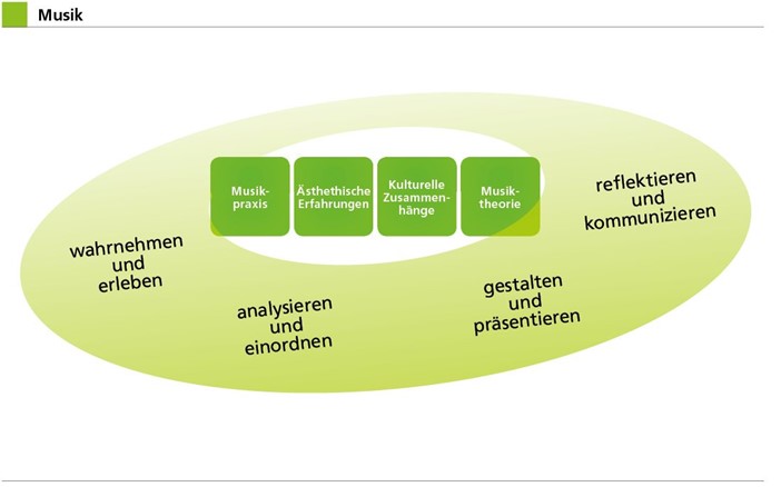 Das Kompetenzstrukturmodell für das Fach Musik bildet die Grundlage der Fachlehrpläne für Grund- und Mittelschulen sowie für Realschulen und Gymnasien mit und ohne musische Ausbildungsrichtung. Es weist prozessbezogene Kompetenzen (äußerer Ring) und Gegenstandsbereiche aus, die alters- und schulartspezifisch gewichtet werden. So stehen im Musikunterricht der Realschule vor allem praktische und handlungsorientierte Zugänge im Zentrum.
